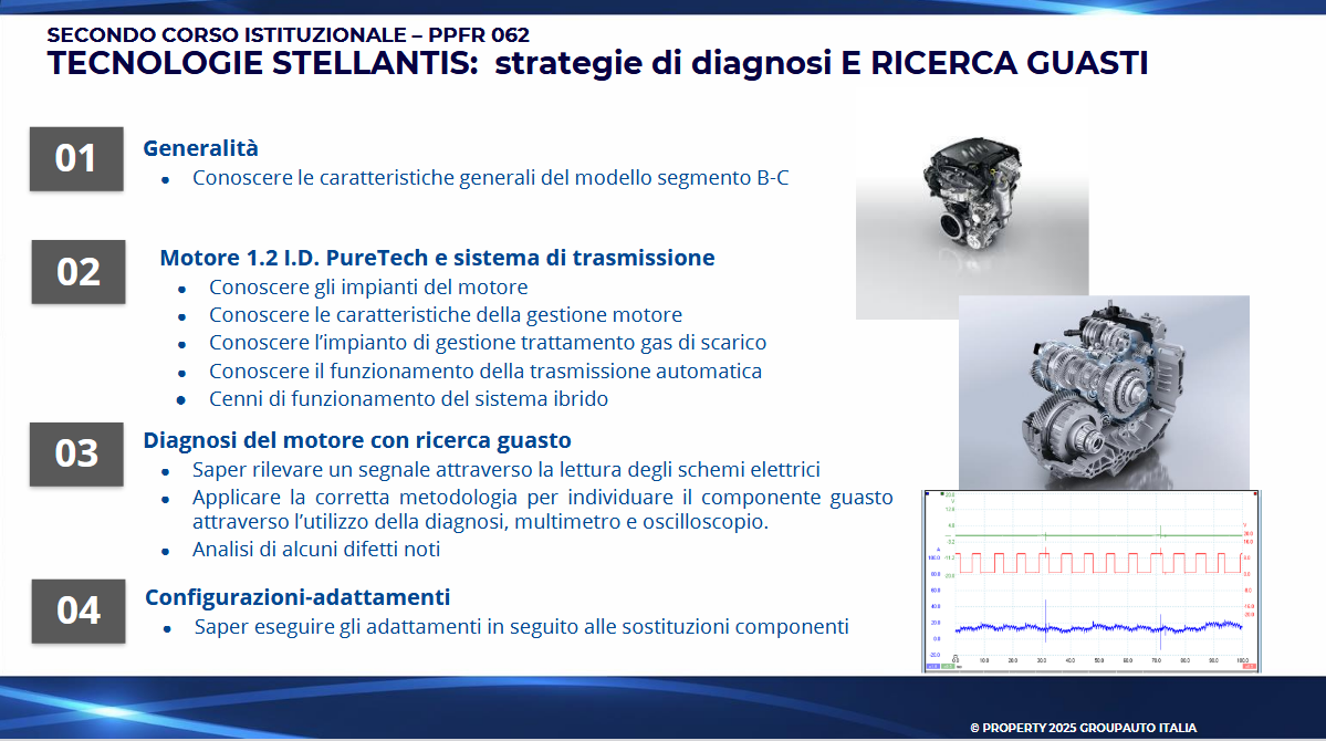 Il corso TECNOLOGIE STELLANTIS: Strategie di diagnosi e ricerca guasti approfondisce i sistemi dei veicoli segmento B-C, con focus sul motore 1.2 PureTech e sulle tecnologie di trasmissione. Fornisce una visione completa delle architetture di gestione motore, emissioni e trasmissioni automatiche. L’approccio è tecnico-pratico e orientato alla diagnosi avanzata.