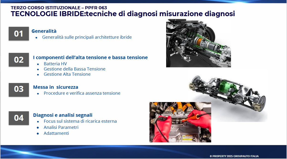 Al termine del corso il partecipante sarà in grado di comprendere il funzionamento dei sistemi ibridi e di interpretare correttamente i segnali diagnostici. Acquisirà competenze nella gestione della sicurezza elettrica e nella verifica dell’assenza di tensione. Saprà inoltre eseguire misurazioni e diagnosi mirate sui principali componenti del veicolo ibrido.